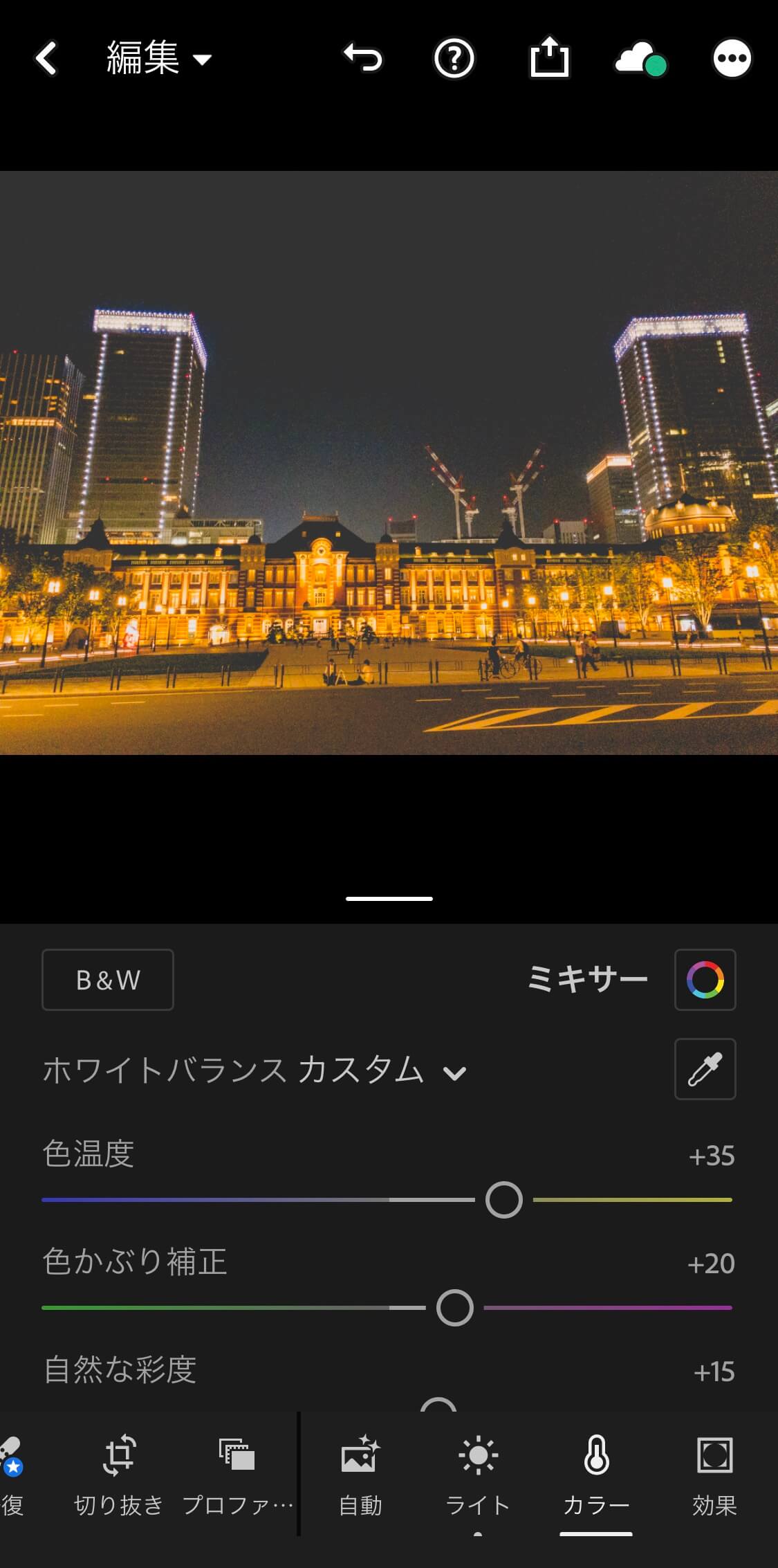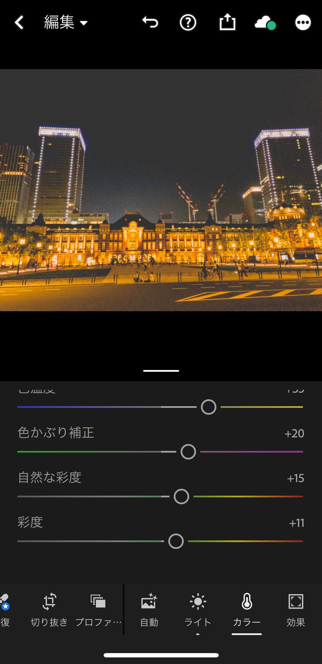 左画像にある色温度、色かぶり補正、自然な彩度、彩度のバーを動かして色合いを調節できます。